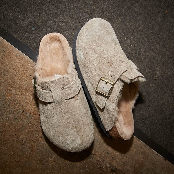 The Boston clog, made cozy for the colder months. Classic suede lends a velvety feel that continues on the inside. The style is fully lined in genuine shearling, right down to the original contoured footbed. A soft, supportive landing every time.