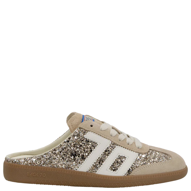 The Back 70 glitter mule brings sparkle to everyday style with a distinctly feminine, boho edge. Designed in shimmering gold glitter, this effortless sneaker mule blends laid-back charm with the brand’s signature vintage detailing. The open-back silhouette adds ease and personality, while subtle suede trims and retro accents keep it unmistakably Back 70. A perfect mix of glamour and casual cool, it’s made for the girlie girl who loves her sneakers with a little shine.